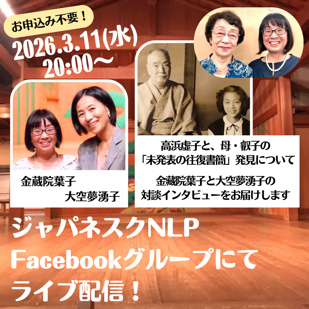 大空夢湧子と金藏院葉子のジャパネスクNLPの第2回ライブです。 海外においては日本の文化に対する興味が高く、特に心理学系の人々がなぜ日本文化に秘密の宝があると思うのか。 また俳句の作者と読み手のコラボレーションで俳句は成り立つことも面白いと思います。